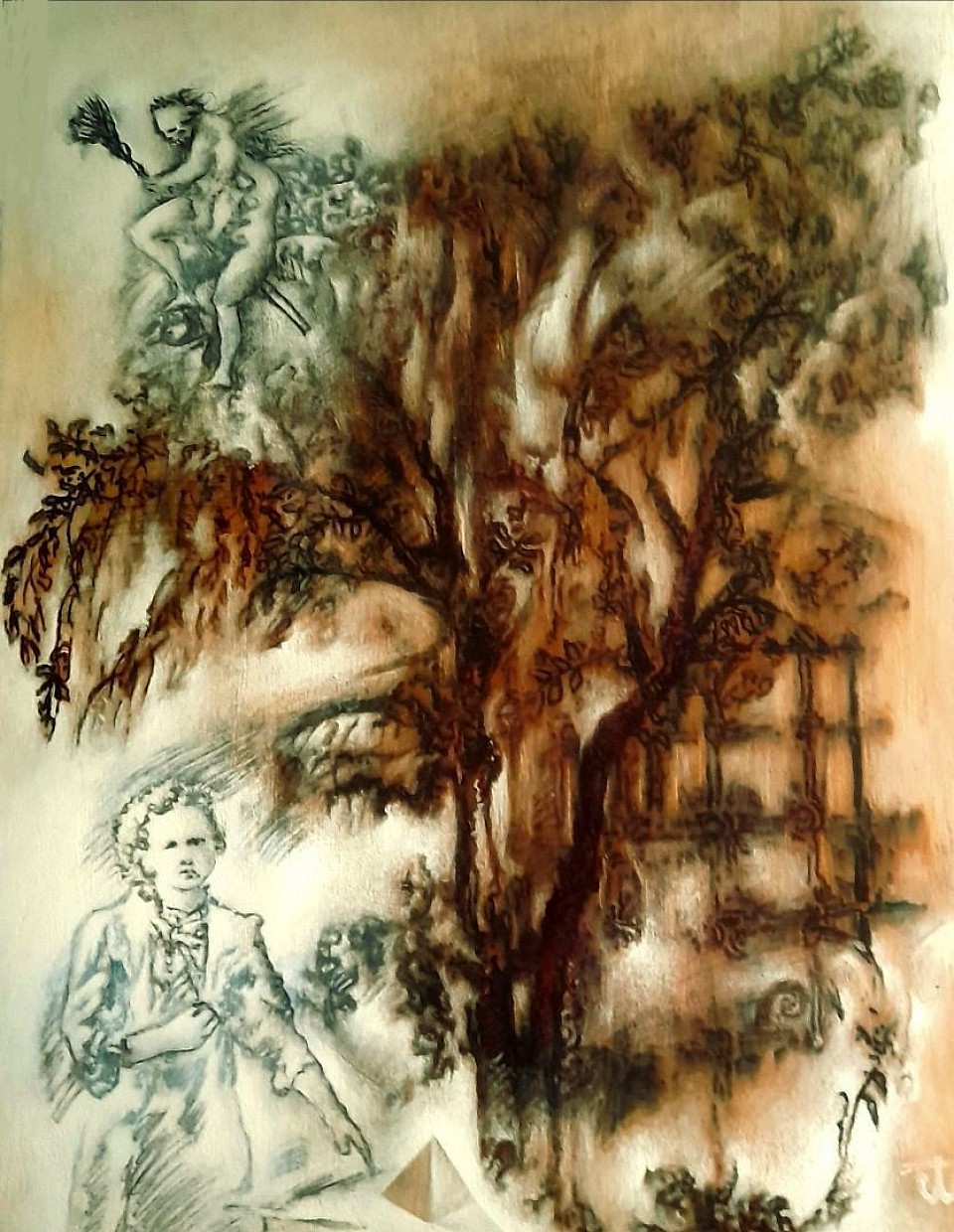 " Maria Sklodowska - Curie in Bagni di Lucca " •βββ‘β β‘ββ• [ A preliminary sketch for a larger project ] ; Diamentions: 37.3 x 49.7 cm, Medium: aquarelle, carbon pencils, white gesso on wooden panel, Cycle : " Tuscan Preminitions " © 1st of March AD.2025; Waldemar A.S. Buczynski onwards. βββ The " digitally created " colours are NEVER the colours of the original artwork.