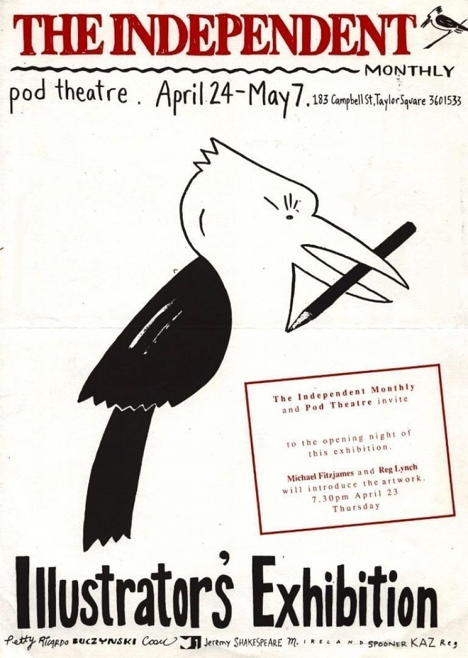 A " flier " advertising the " Independent Monthly " magazine's exhibition of published artworks. [ the Australian bird " Laughing Kookaburra " was not drawn by me ]. The event was organised by Mr Max Suitch in Sydney, New South Wales , Australia in 1991. It featured the best [ ? ] of illustrative talent the continent had to offer. I did not attend the opening in Sydney and perhaps it was " rude " [ ? ] since the first artist - Bruce Petty was known to me. He visited my studio at 4/69 Maystone Street, Hawthorn East, Victoria and sat for my portrait for the " Archibald Prize " in 1989. During his visit [ which was synchronised with him visiting his elderly father at the old people's home in Melbourne ] he did a small portrait of me with a instant marker pencil , gave it to me and said :" I always wanted to be like you ". That was very strange to hear, since Bruce was the only Australian Oscar winner in the " Animation " category at that time.