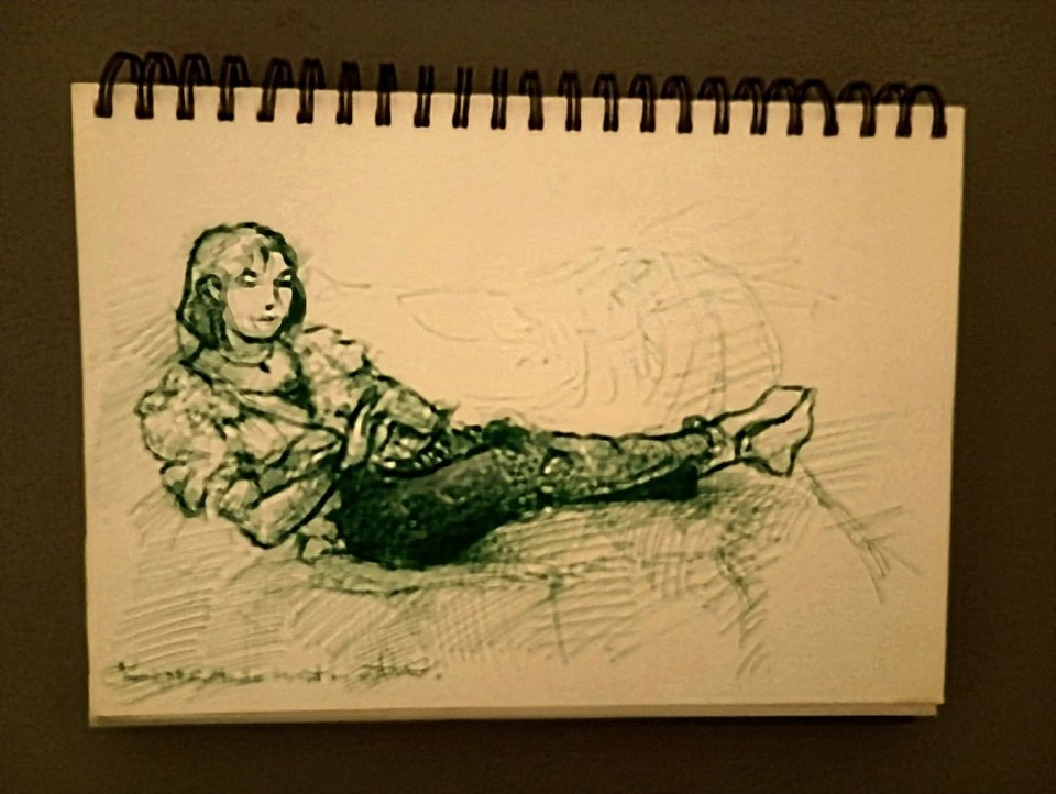 " Study of Karen " [ preliminary sketch for larger projects ] * Diamentions: 30 X 21 cm, Medium: Green " Biro " pen [ trashy, chemical gimmick not recommended for " newbies " ; difficult to control & work with ] on white Italian " Fabriano " paper ; Bagni di Lucca, Toscana, Italian Republic ; All ©οΈ 5th of September A.D. 2024; Waldemar A.S. Buczynski onwards.